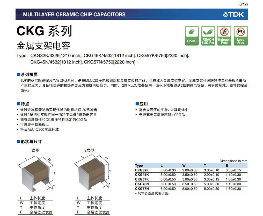 应用领域:• 需要大容值的平滑、去耦用途中 • 无线充电等谐振回路:c0g品